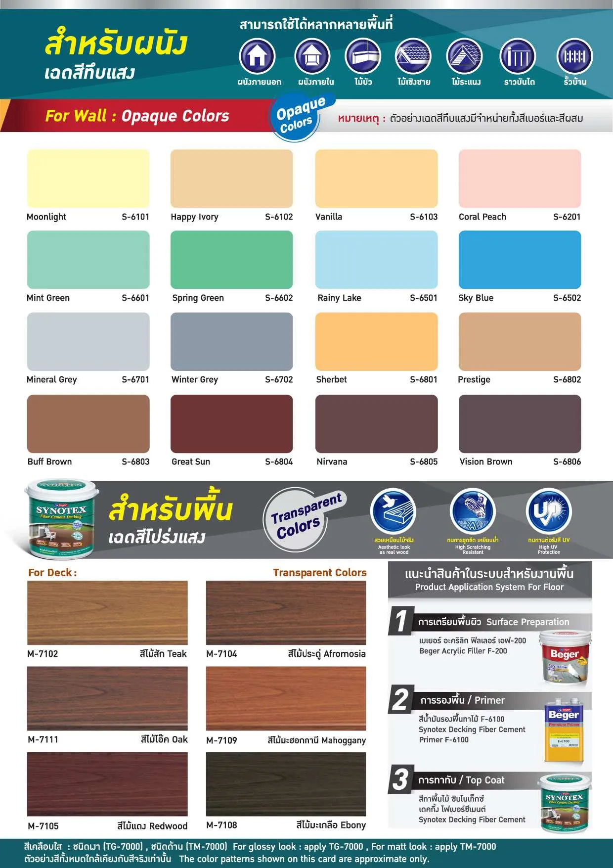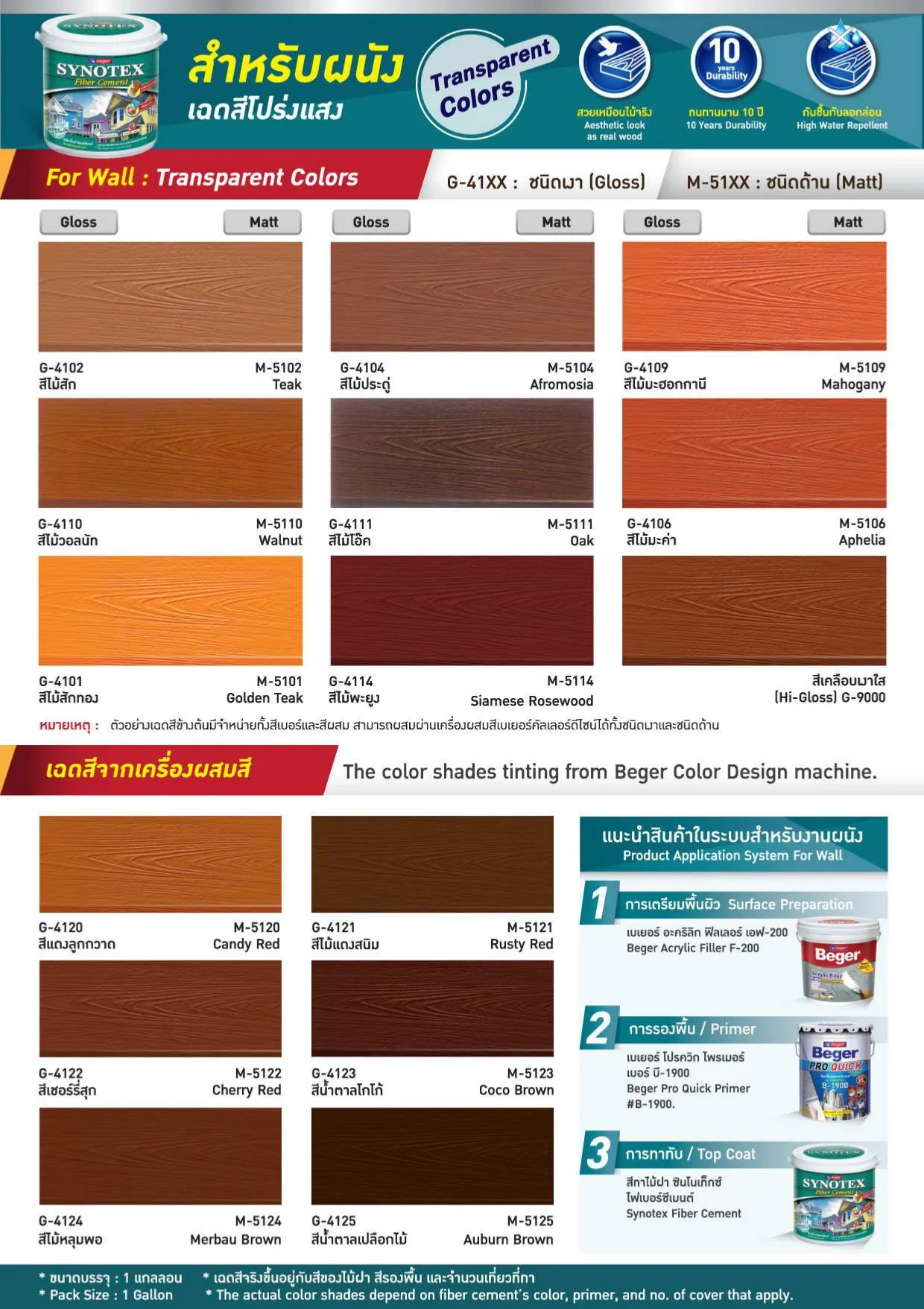 | เฉดสี Beger | M-7102 สีไม้สัก, M-7104 สีไม้ประดู่, M-7105 สีไม้แดง, M-7108 สีไม้มะเกลือ, M-7109 สีไม้มะฮอกกานี, M-7111 สีไม้โอ๊ค |