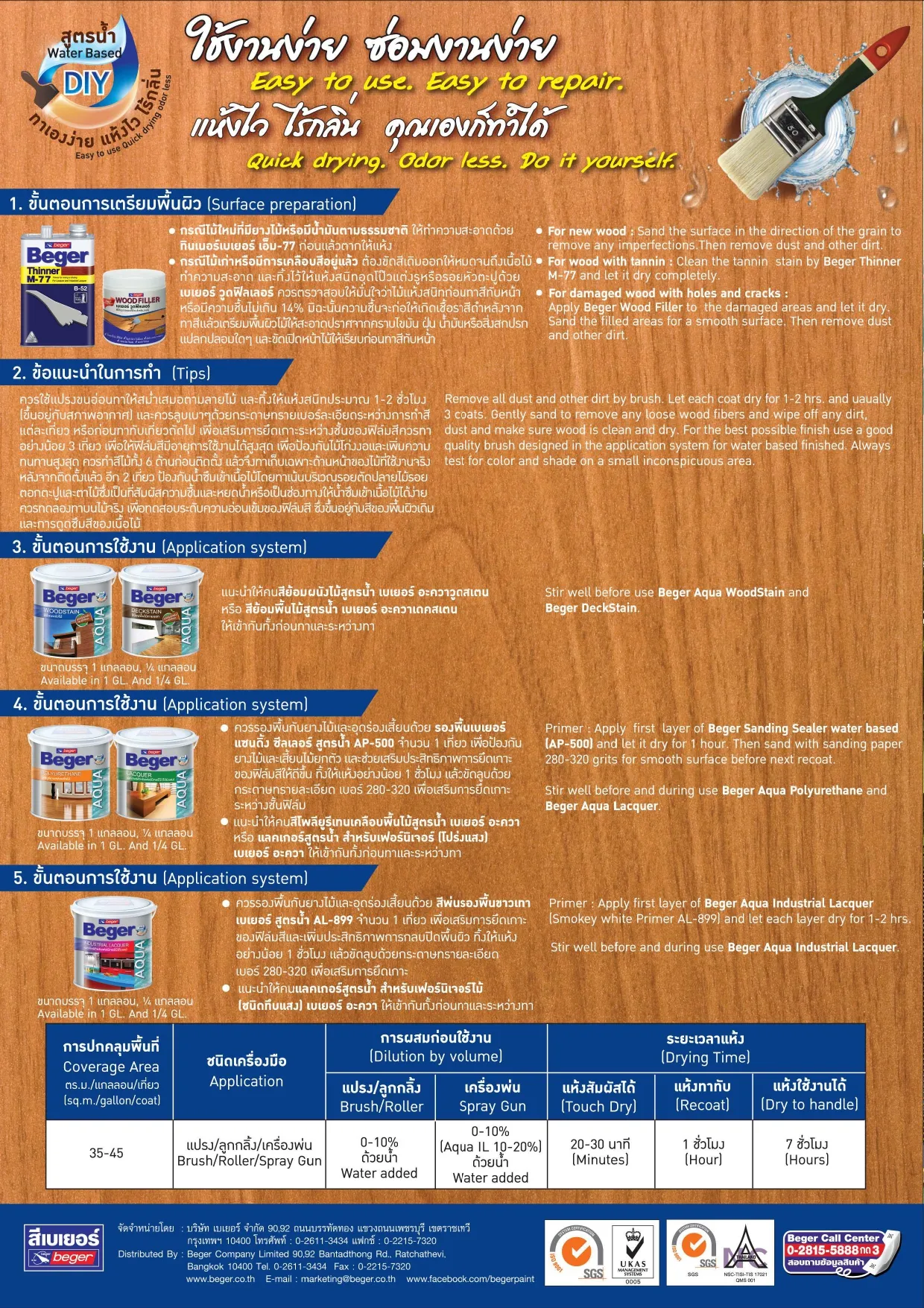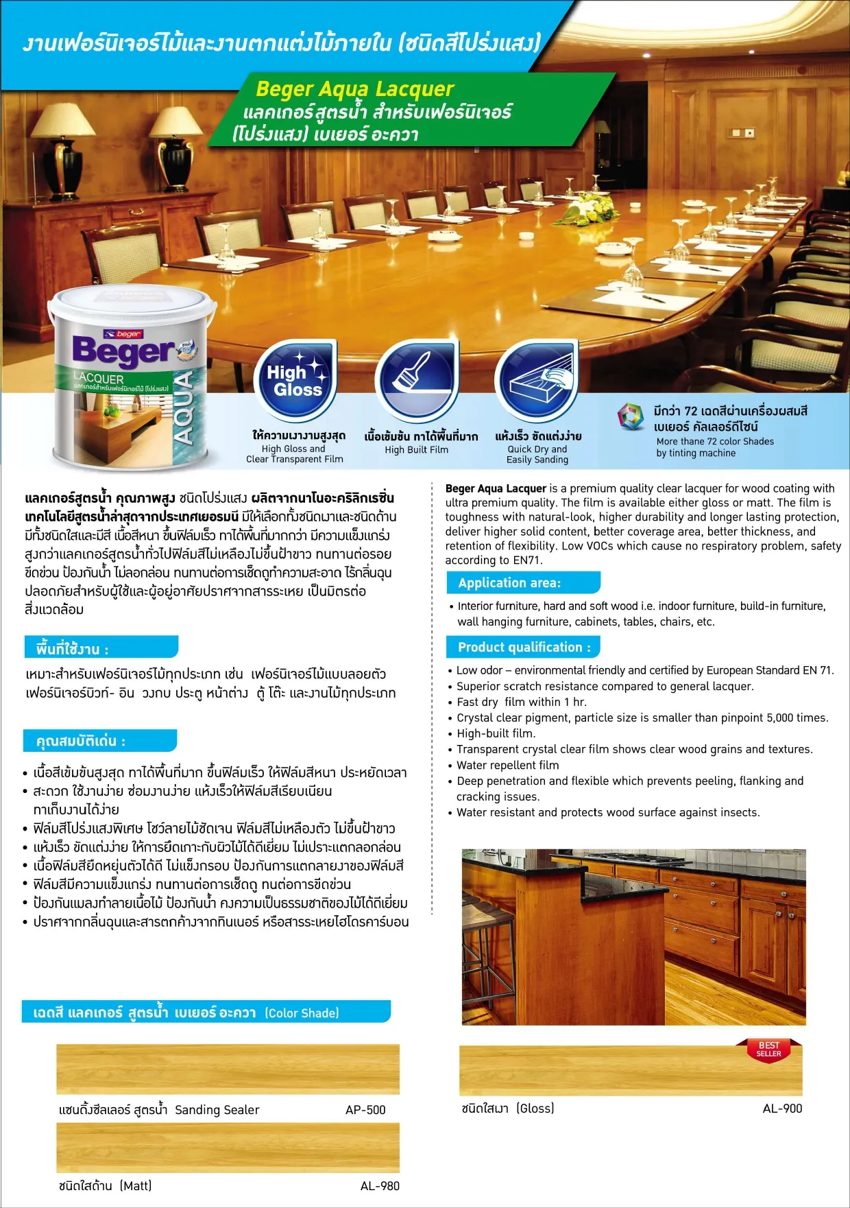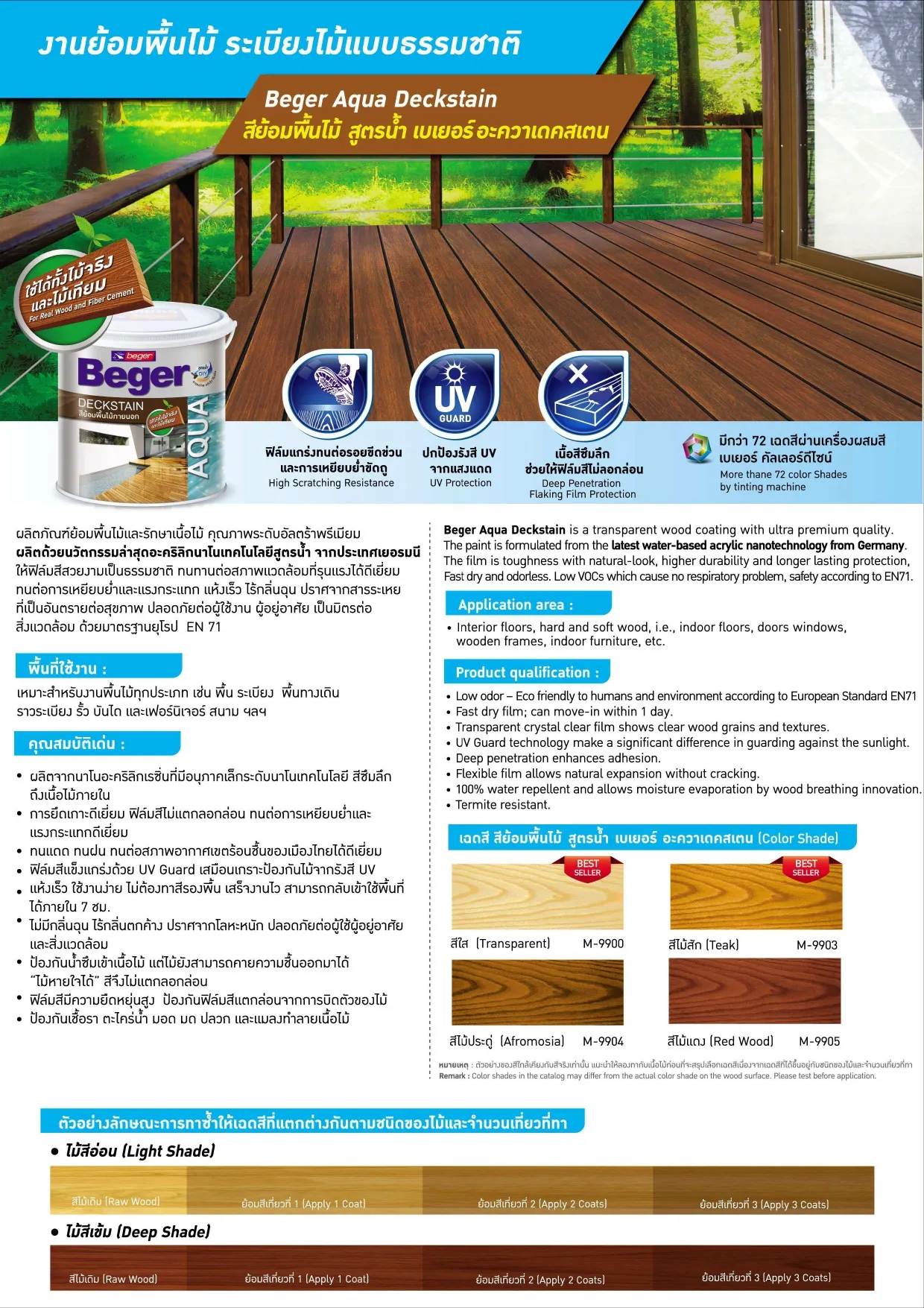 กลิ่นไม่ฉุน ปลอดภัยต่อผู้อยู่อาศัยและสิ่งแวดล้อม ด้วยมาตรฐานความปลอดภัยจากยุโรป EN71 ฟิล์มสีแห้งเร็วเพียง 1 ชั่วโมง สามารถกลับเข้าใช้งานในพื้นที่ได้ภายใน 1 วัน เนื้อสีซึมลึก ด้วย Nano-Acrylic เพิ่มการยึดเกาะ และมีความยืดหยุ่นสูง ฟิล์มสีจึงไม่ลอกล่อน แตกพอง ฟิล์มสีโปร่งแสง 100%ด้วย Crystal Clear โชว์ลายไม้ชัดเจน ปกป้องจากรังสี UV และแสงแดด ด้วย UV Guard ไม้หายใจได้ ป้องกันน้ำ แต่ไม้ยังคายความชื้นได้ ป้องกันเชื้อรา และแมลงกินไม้ มีกว่า 72 เฉด ผ่านเครื่องผสมสี