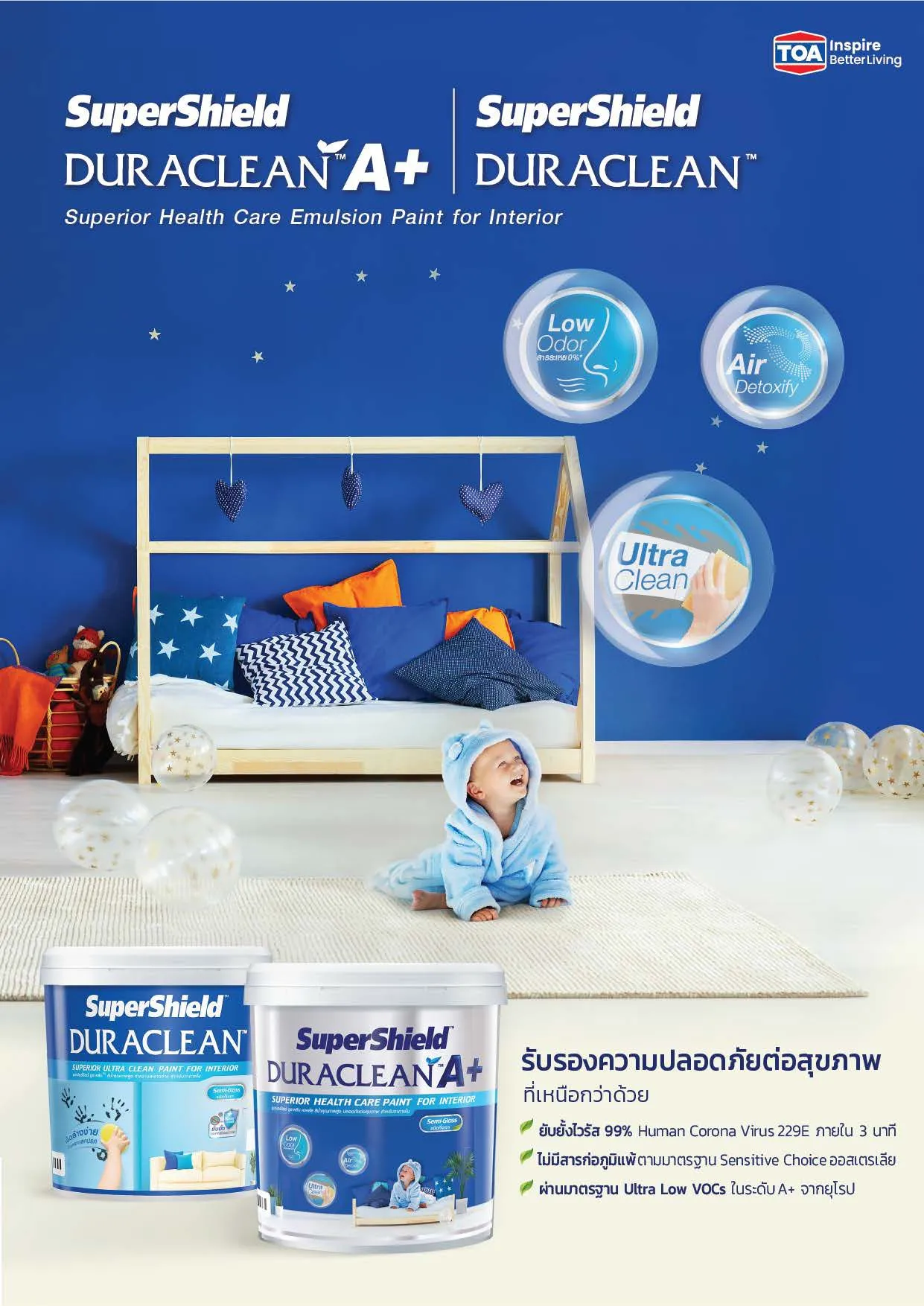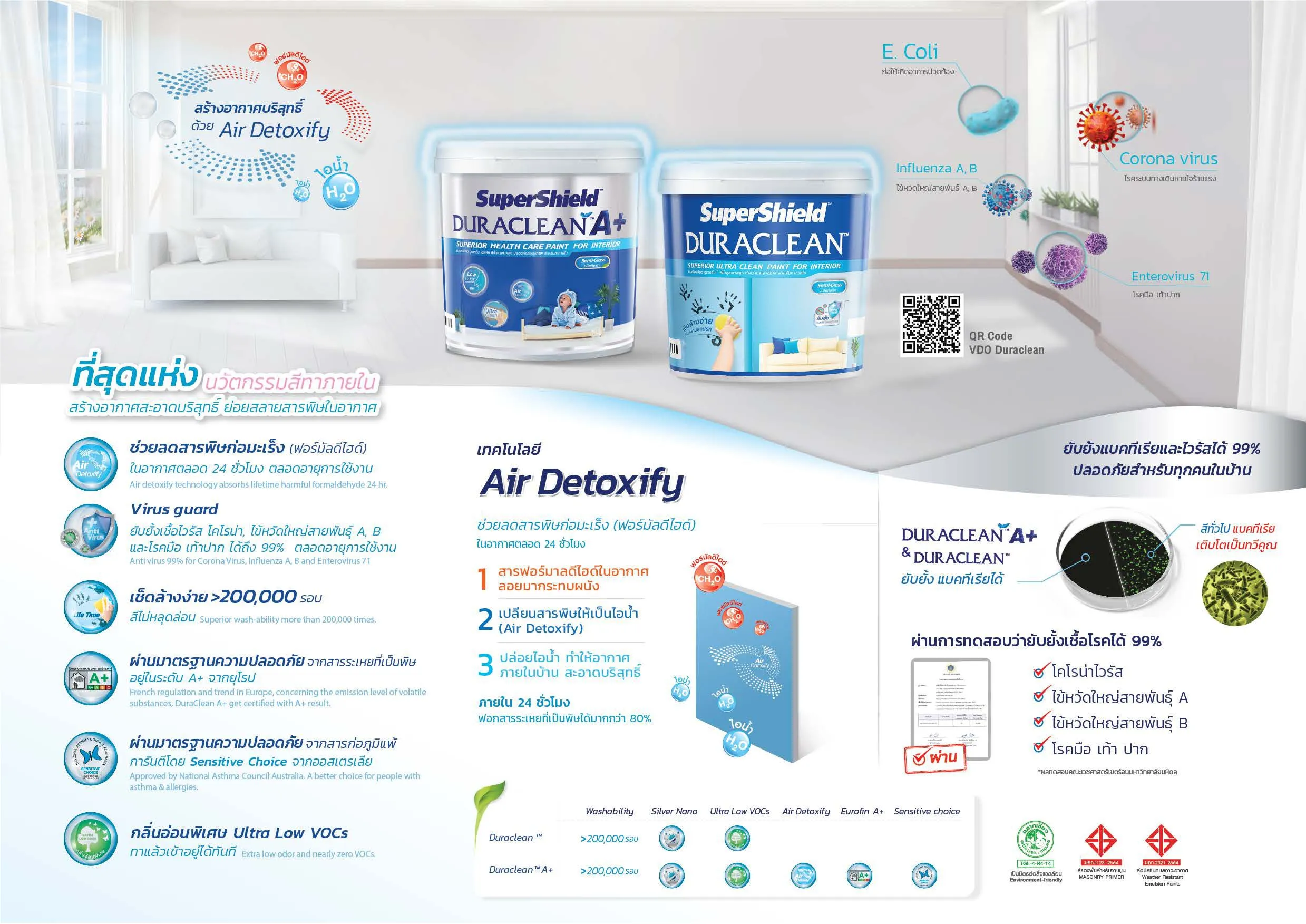 ที่สุดแห่งนวัตกรรมสีทาภายในใส่ใจเพื่อสุขภาพ เช็ดล้างทำความสะอาดได้ปลอดภัย ไร้แบคทีเรีย ไร้กลิ่น ทั้งยังสร้างอากาศบริสุทธิ์ ขจัดสารพิษอันตรายเพื่อคุณภาพชีวิตที่ดีกว่าของทุกคนในครอบครัว ใช้วัตถุดิบจากธรรมชาติ ไม่ใช้สาร APEO จึงปลอดภัยสูงสุดต่อผู้อยู่อาศัย และสิ่งแวดล้อม