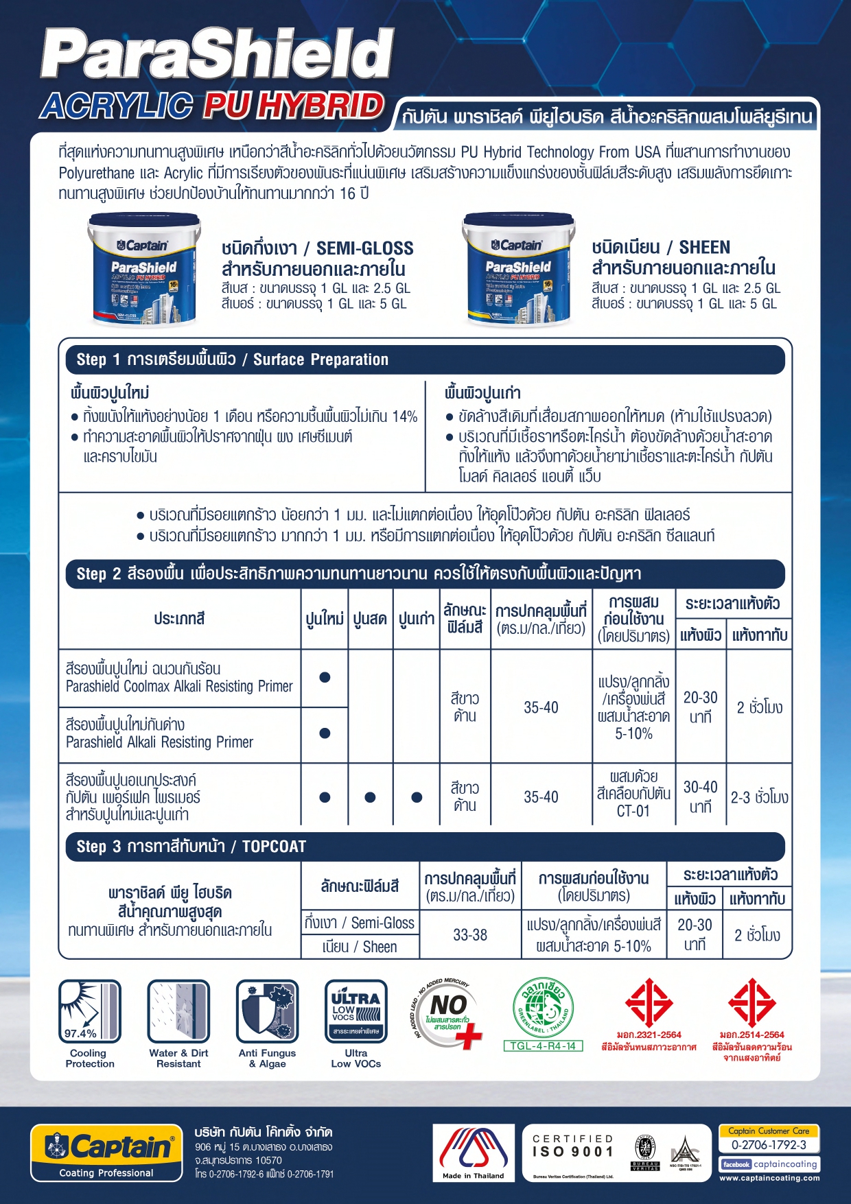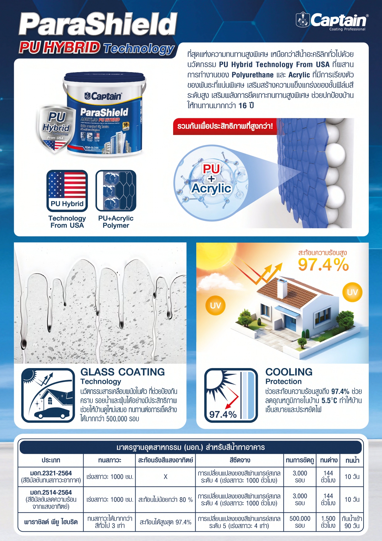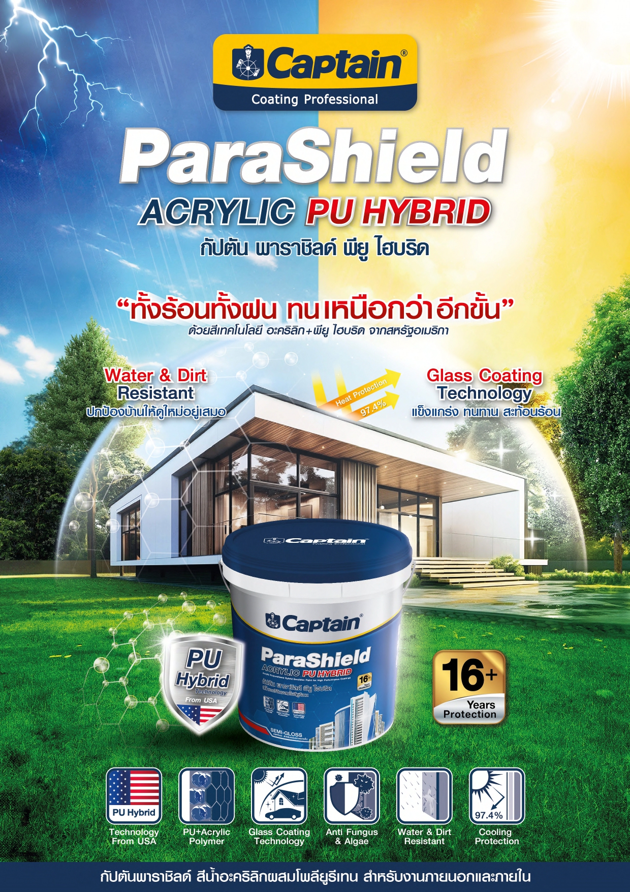 กัปตัน พาราชิลด์ พียูไฮบริด ที่สุดแห่งความทนทานสูงพิเศษ ด้วยนวัตกรรม PU Hybrid Technology From USA ที่ผสานการทำงานของ Polyurethane และ Acrylic ที่มีการเรียงตัวของพันธะที่แน่นพิเศษ เสริมสร้างความแข็งแกร่งของชั้นฟิล์มสีระดับสูง เสริมการยึดเกาะช่วยปกป้องบ้านให้ทนทานมากกว่า 16 ปี