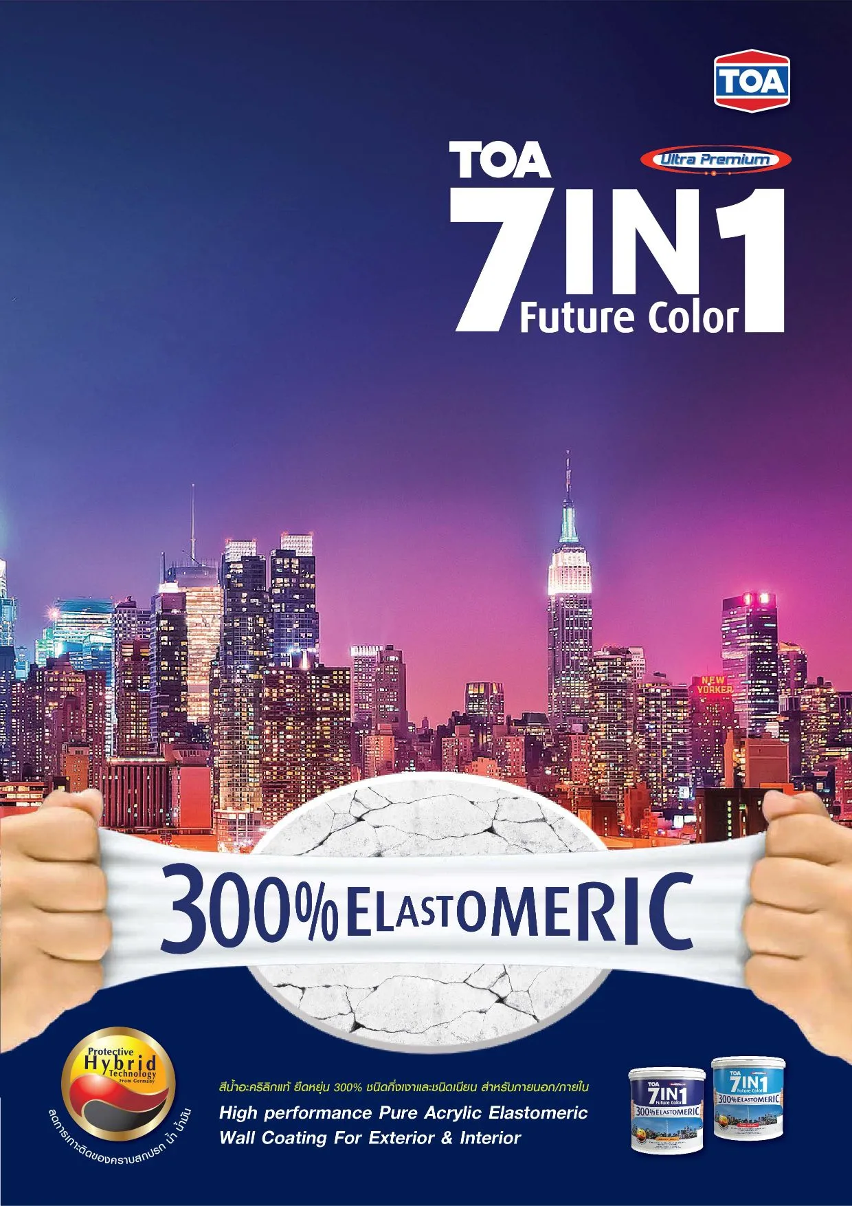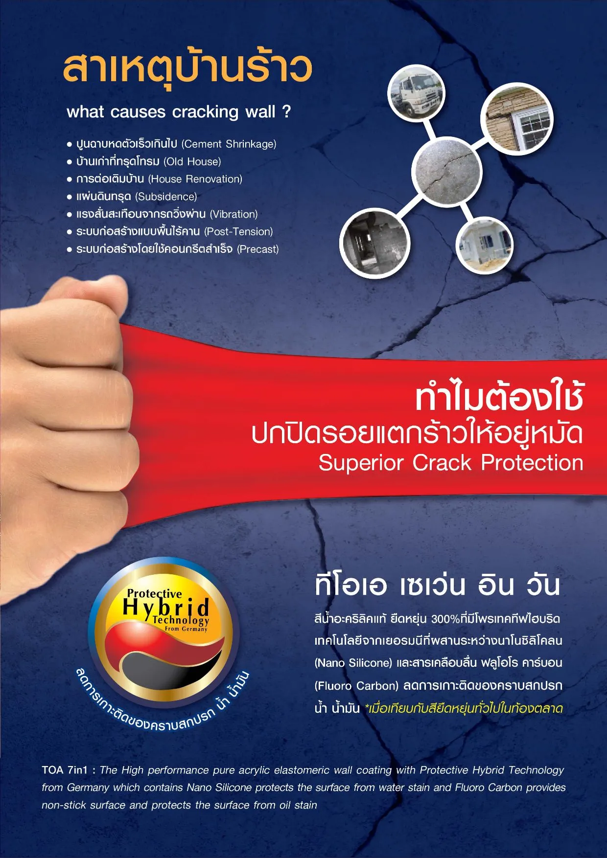 สีน้ำอะคริลิกแท้ คุณสมบัติโดดเด่น ยืดหยุ่นสูง 300% ปกป้องบ้านของคุณจากทุกปัญหา แก้ปัญหาบ้านร้าว แตกลายงา จากปูนหดตัว หรือบ้านทรุดตัว ปกปิดทุกรอยแตกร้าว เนียนเหมือนบ้านใหม่ ทั้งยังเพิ่มประสิทธิภาพด้วย Protective Hybrid Technology สุดยอดเทคโนโลยีจากเยอรมัน ผสานคุณสมบัติลดการเกาะติดของคราบสกปรกน้ำและน้ำมัน ไว้ในสียืดหยุ่นสูง ทีโอเอ เซเว่น อิน วัน