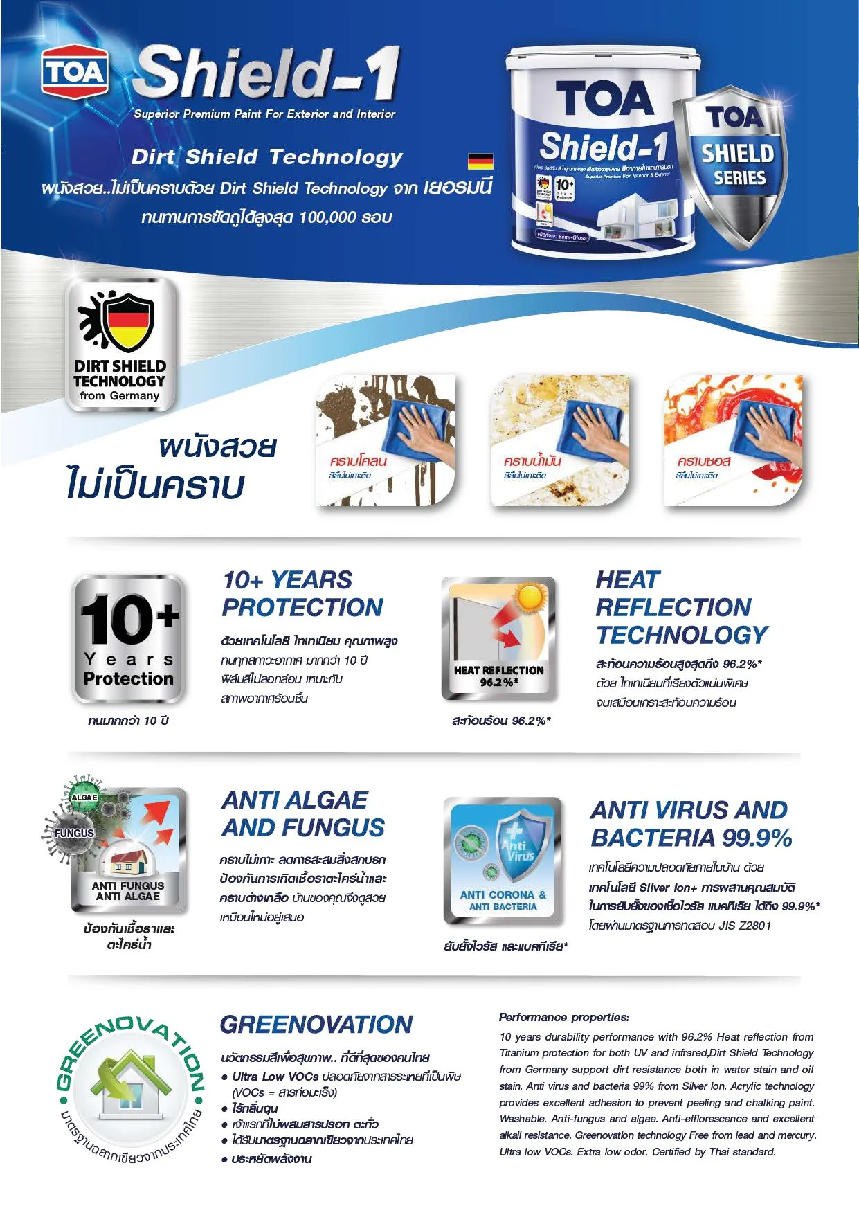 สีน้ำเกรดพรีเมียมคุณภาพสูง ทนทานมากกว่า 10 ปี ผนังสวย ไม่เป็นคราบด้วย Dirt Shield Technology เทคโนโลยีล่าสุดจากประเทศเยอรมัน ปกป้องทุกคราบได้เหนือกว่า ทนทานต่อเชื้อราและตะไคร่น้ำ ได้ดีกว่าเดิมถึง 2 เท่า และสะท้อนความร้อนได้ยอดเยี่ยม สูงถึง 96.2%*