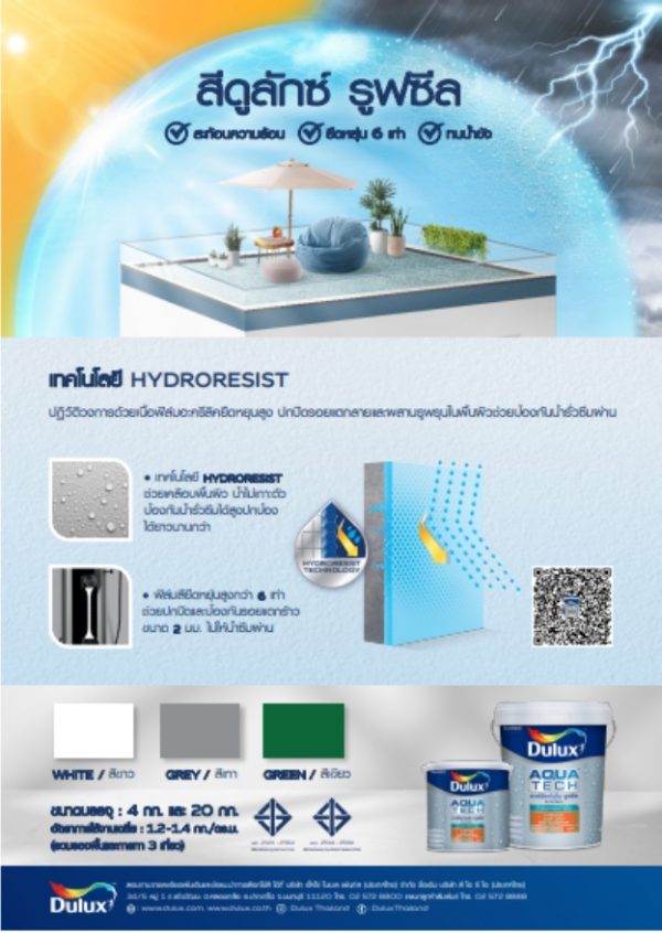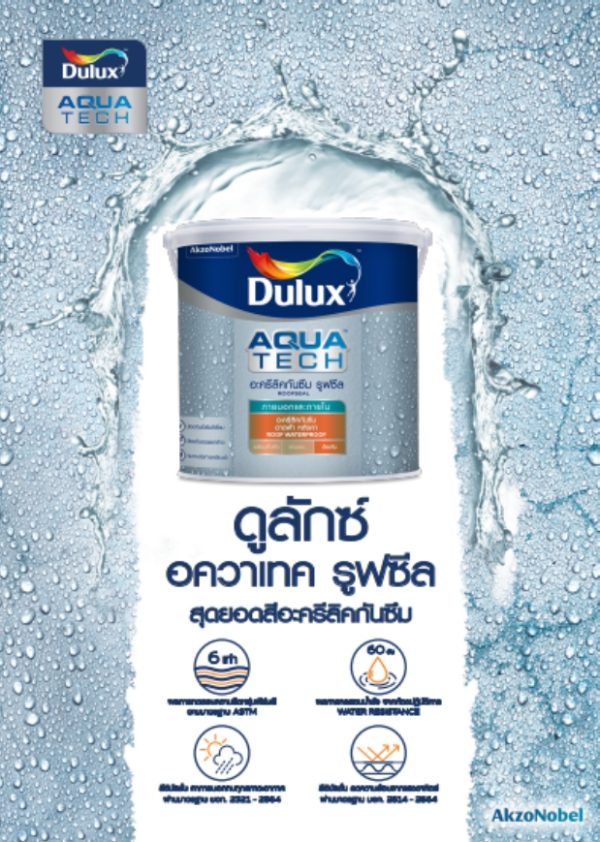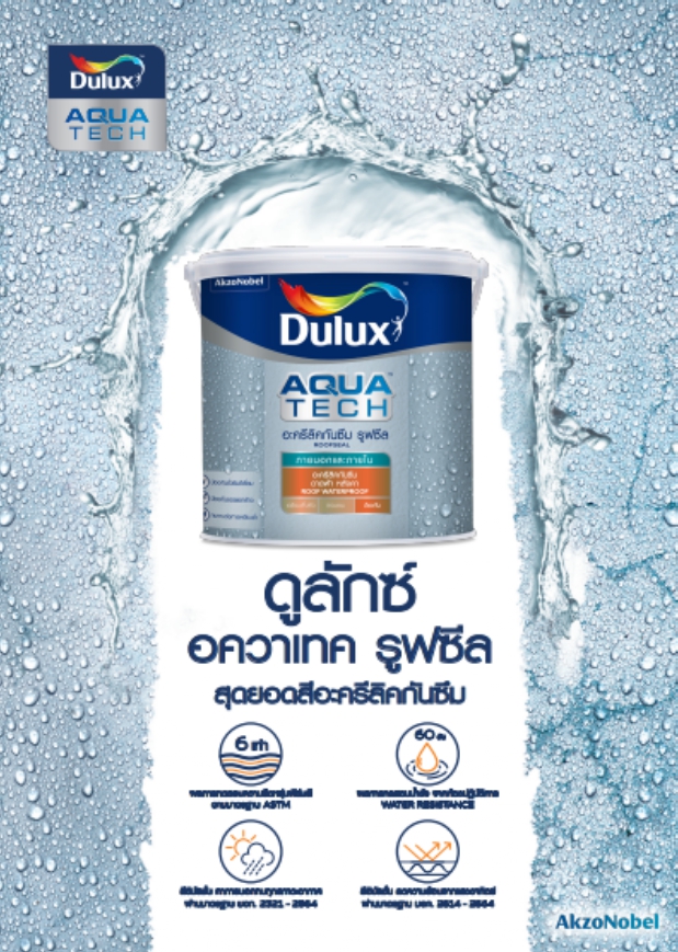 ดูลักซ์ อควาเทค อะครีลิคกันซึม ดาดฟ้าและหลังคา ให้ความทนทานสูง ทาง่าย ฟิล์มสีหนาและยืดหยุ่นสูง 6-8 เท่าเมื่อเทียบกับสีอะครีลิคทั่วไป เหมาะสำหรับทาดาดฟ้า หลังคา ทำจากผงสีละเอียดและกาวโพลีเมอร์ที่มีความทนทานสูงสุด นวัตกรรมล้ำสมัยด้วยเทคโนโลยี Hydroresist ประกอบเป็นชั้นที่ป้องกันน้ำซึมผ่านได้ยาก ฟิล์มสียืดหยุ่นสูง ปกป้องพื้นผิวที่เป็นรูพรุน ช่วยผสานรอยแตกร้าวและป้องกันน้ำซึม เชื้อราและตะไคร่น้ำ